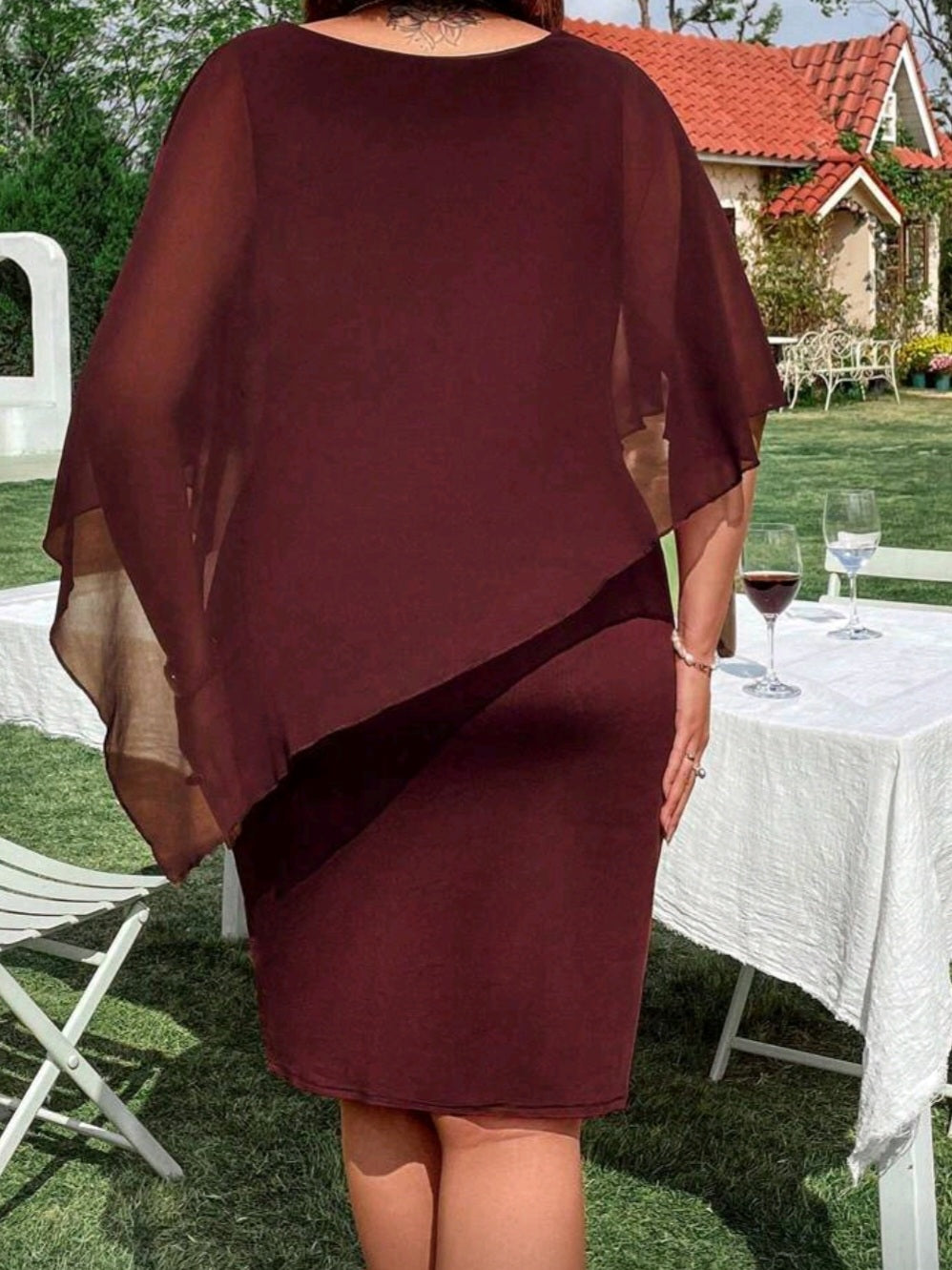 #0037 V-Neck Rhinestone Accent Knit & Chiffon Splicing Dress